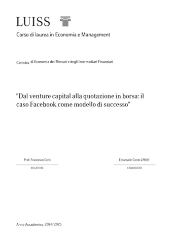 Conte, Emanuele (A.A. 2024/2025) Dal venture capital alla quotazione in borsa: il caso Facebook come modello di successo. Tesi di Laurea in Economia dei mercati e degli intermediari finanziari, Luiss Guido Carli, relatore Francesco Cerri, pp. 63. [Bachelor's Degree Thesis]