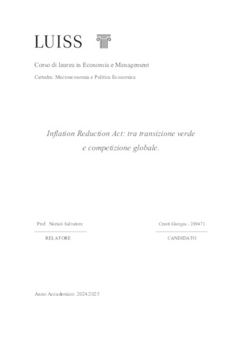 Cresti, Giorgia (A.A. 2024/2025) Inflation Reduction Act: tra transizione verde e competizione globale. Tesi di Laurea in Macroeconomia e politica economica, Luiss Guido Carli, relatore Salvatore Nisticò, pp. 92. [Bachelor's Degree Thesis]