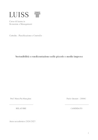 Granieri, Paolo (A.A. 2024/2025) Sostenibilità e rendicontazione nelle piccole e medie imprese. Tesi di Laurea in Pianificazione e controllo, Luiss Guido Carli, relatore Maria Pia Maraghini, pp. 51. [Bachelor's Degree Thesis]
