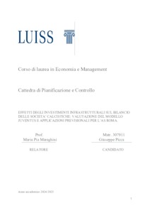 Picca, Giuseppe (A.A. 2024/2025) Effetti degli investimenti infrastrutturali sul bilancio delle società calcistiche: valutazione del modello Juventus e applicazioni previsionali per l’AS Roma. Tesi di Laurea in Pianificazione e controllo, Luiss Guido Carli, relatore Maria Pia Maraghini, pp. 79. [Bachelor's Degree Thesis]