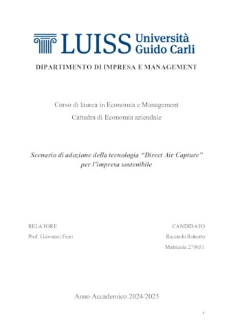 Roberto, Riccardo (A.A. 2024/2025) Scenario di adozione della tecnologia direct air capture per l’impresa sostenibile. Tesi di Laurea in Economia aziendale, Luiss Guido Carli, relatore Giovanni Fiori, pp. 45. [Bachelor's Degree Thesis]