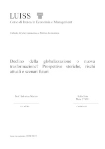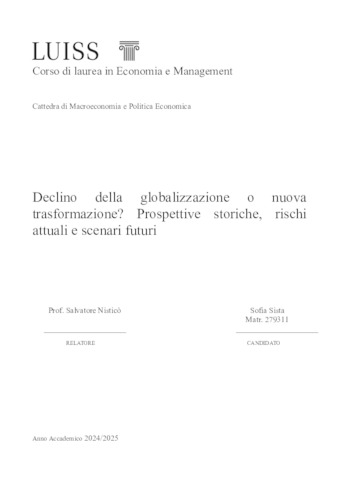 Sista, Sofia (A.A. 2024/2025) Declino della globalizzazione o nuova trasformazione? Prospettive storiche, rischi attuali e scenari futuri. Tesi di Laurea in Macroeconomia e politica economica, Luiss Guido Carli, relatore Salvatore Nisticò, pp. 83. [Bachelor's Degree Thesis]