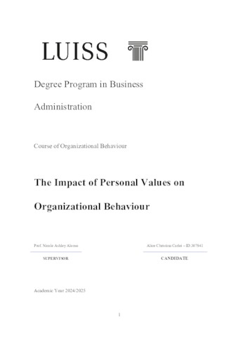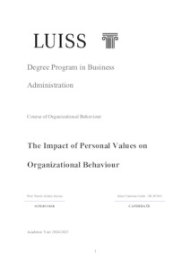 Carlei, Alice Christina (A.A. 2024/2025) The impact of personal values on organizational behaviour. Tesi di Laurea in Organizational behavior, Luiss Guido Carli, relatore Nicola Ashley Alonso, pp. 74. [Bachelor's Degree Thesis]