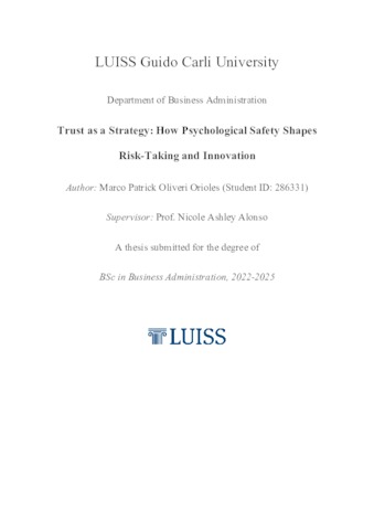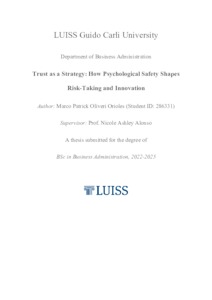 Olivieri Orioles, Marco Patrick (A.A. 2024/2025) Trust as a strategy: how psychological safety shapes risk-taking and innovation. Tesi di Laurea in Organizational behavior, Luiss Guido Carli, relatore Nicola Ashley Alonso, pp. 50. [Bachelor's Degree Thesis]