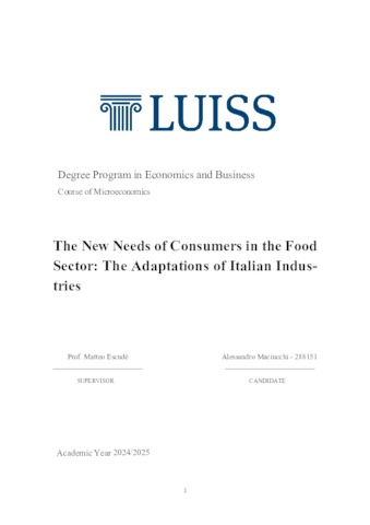 Maciucchi, Alessandro (A.A. 2024/2025) The new needs of consumers in the food sector: the adaptations of Italian industries. Tesi di Laurea in Microeconomics, Luiss Guido Carli, relatore Matteo Escude, pp. 32. [Bachelor's Degree Thesis]