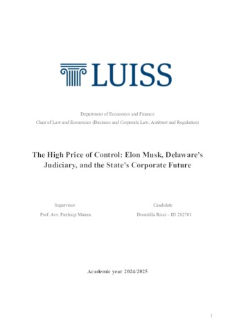 Ricci, Domitilla (A.A. 2024/2025) The high price of control: Elon Musk, Delaware’s judiciary and the State’s corporate future. Tesi di Laurea in Law and economics (corporate and business law: antitrust and regulation), Luiss Guido Carli, relatore Pierluigi Matera, pp. 115. [Bachelor's Degree Thesis]