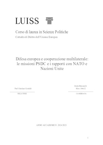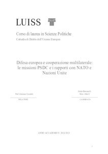 Baroncelli, Giulia (A.A. 2024/2025) Difesa europea e cooperazione multilaterale: le missioni PSDC e i rapporti con NATO e Nazioni Unite. Tesi di Laurea in Diritto dell'Unione europea, Luiss Guido Carli, relatore Gianluca Contaldi, pp. 112. [Bachelor's Degree Thesis]