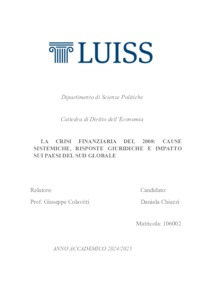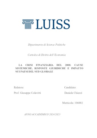 Chiezzi, Daniela (A.A. 2024/2025) La crisi finanziaria del 2008: cause sistematiche, risposte giuridiche e impatto sui Paesi del Sud globale. Tesi di Laurea in Diritto dell'economia, Luiss Guido Carli, relatore Giuseppe Colavitti, pp. 91. [Bachelor's Degree Thesis]