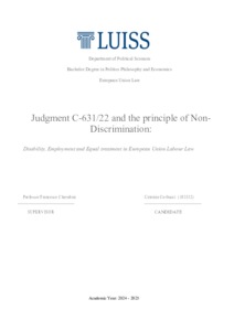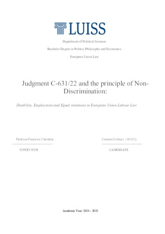 Corbucci, Caterina (A.A. 2024/2025) Judgment C-631/22 and the principle of non-discrimination: disability, employment and equal treatment in European Union labour law. Tesi di Laurea in European union law, Luiss Guido Carli, relatore Francesco Cherubini, pp. 66. [Bachelor's Degree Thesis]
