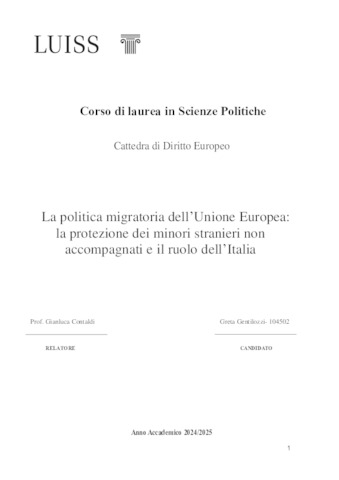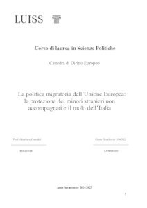 Gentilozzi, Greta (A.A. 2024/2025) La politica migratoria dell’Unione europea: la protezione dei minori stranieri non accompagnati e il ruolo dell’Italia. Tesi di Laurea in Diritto dell'Unione europea, Luiss Guido Carli, relatore Gianluca Contaldi, pp. 83. [Bachelor's Degree Thesis]