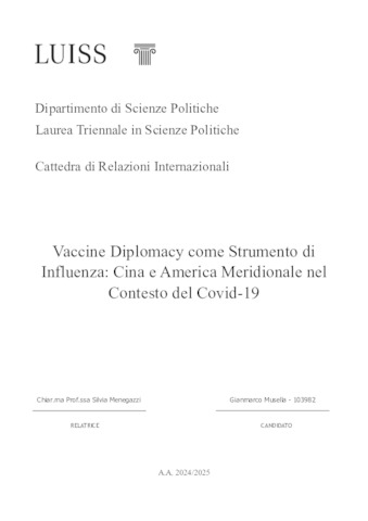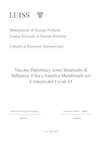 Musella, Gianmarco (A.A. 2024/2025) Vaccine diplomacy come strumento di influenza: Cina e America meridionale nel contesto del Covid-19. Tesi di Laurea in Relazioni internazionali, Luiss Guido Carli, relatore Silvia Menegazzi, pp. 88. [Bachelor's Degree Thesis]