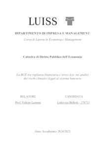 Bellotti, Ludovica (A.A. 2024/2025) La BCE tra vigilanza finanziaria e stress test: un’analisi dei rischi climatici legati al sistema bancario. Tesi di Laurea in Diritto pubblico dell'economia, Luiss Guido Carli, relatore Valerio Lemma, pp. 62. [Bachelor's Degree Thesis]