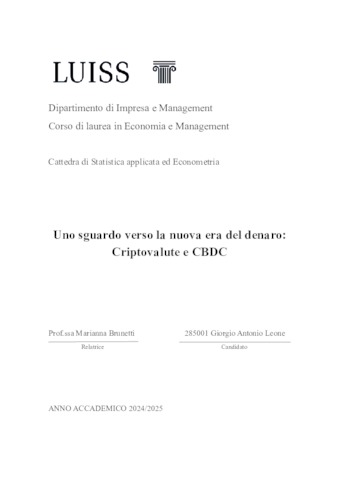 Leone, Giorgio Antonio (A.A. 2024/2025) Uno sguardo verso la nuova era del denaro: criptovalute e CBDC. Tesi di Laurea in Statistica applicata ed econometria, Luiss Guido Carli, relatore Marianna Brunetti, pp. 52. [Bachelor's Degree Thesis]