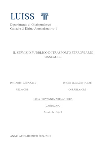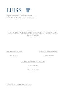 Ancora, Luca Giovanni Maria (A.A. 2024/2025) Il servizio pubblico di trasporto ferroviario passeggeri. Tesi di Laurea in Diritto amministrativo 1, Luiss Guido Carli, relatore Aristide Police, pp. 203. [Single Cycle Master's Degree Thesis]
