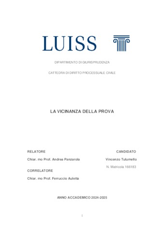 Tulumello, Vincenzo (A.A. 2024/2025) La vicinanza della prova. Tesi di Laurea in Diritto processuale civile, Luiss Guido Carli, relatore Andrea Panzarola, pp. 159. [Single Cycle Master's Degree Thesis]