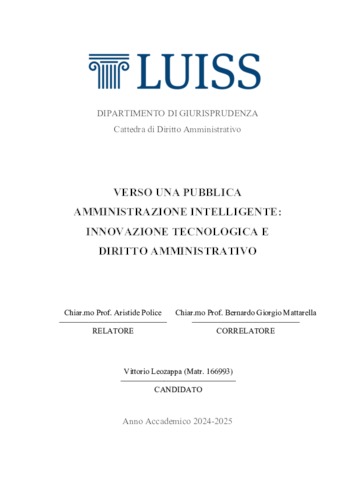 Leozappa, Vittorio (A.A. 2024/2025) Verso una pubblica amministrazione intelligente: innovazione tecnologica e diritto amministrativo. Tesi di Laurea in Diritto amministrativo 1, Luiss Guido Carli, relatore Aristide Police, pp. 144. [Single Cycle Master's Degree Thesis]
