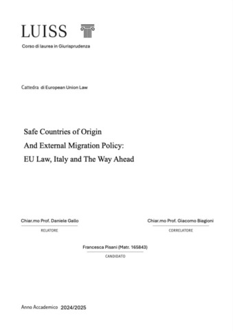 Pisani, Francesca (A.A. 2024/2025) Safe countries of origin and external migratioin policy: EU law, Italy and the way ahead. Tesi di Laurea in Diritto dell'Unione europea, Luiss Guido Carli, relatore Daniele Gallo, pp. 161. [Single Cycle Master's Degree Thesis]