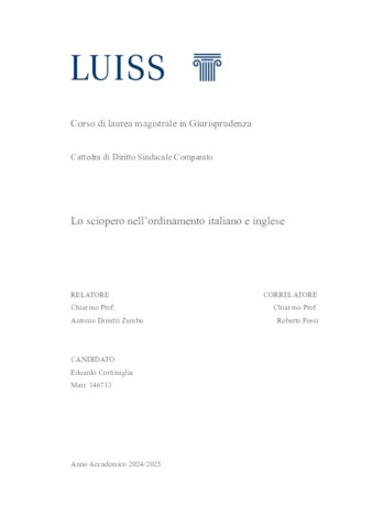 Cortimiglia, Edoardo (A.A. 2024/2025) Lo sciopero nell’ordinamento italiano e inglese. Tesi di Laurea in Diritto sindacale comparato, Luiss Guido Carli, relatore Antonio Dimitri Zumbo, pp. 99. [Single Cycle Master's Degree Thesis]