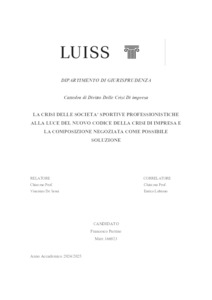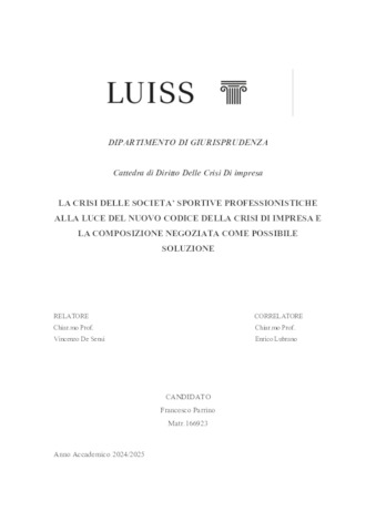 Parrino, Francesco (A.A. 2024/2025) La crisi delle società sportive professionistiche alla luce del nuovo codice della crisi di impresa e la composizione negoziata come possibile soluzione. Tesi di Laurea in Diritto delle crisi d'impresa, Luiss Guido Carli, relatore Vincenzo De Sensi, pp. 171. [Single Cycle Master's Degree Thesis]