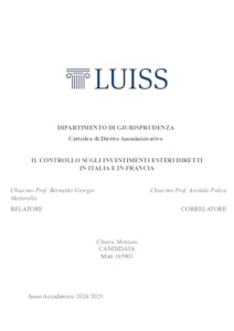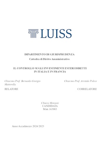Menzani, Chiara (A.A. 2024/2025) Il controllo sugli investimenti esteri diretti in Italia e in Francia. Tesi di Laurea in Diritto amministrativo 1, Luiss Guido Carli, relatore Bernardo Giorgio Mattarella, pp. 173. [Single Cycle Master's Degree Thesis]
