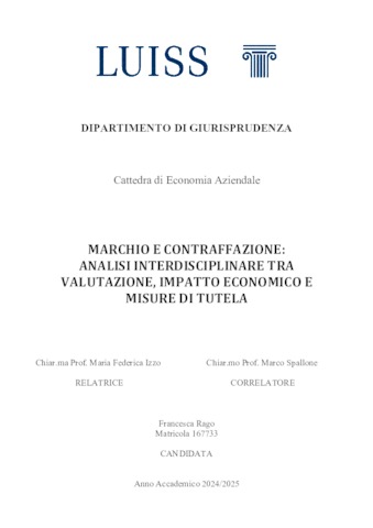 Rago, Francesca (A.A. 2024/2025) Marchio e contraffazione: analisi interdisciplinare tra valutazione, impatto economico e misure di tutela. Tesi di Laurea in Economia aziendale, Luiss Guido Carli, relatore Maria Federica Izzo, pp. 126. [Single Cycle Master's Degree Thesis]