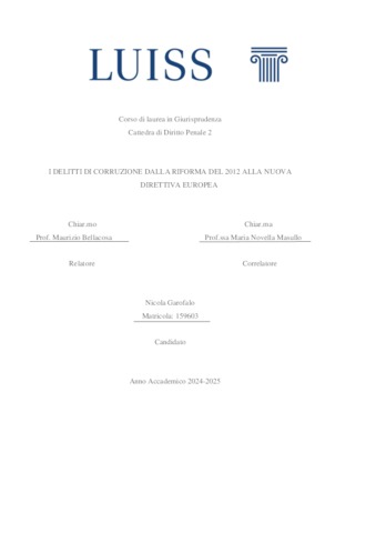 Garofalo, Nicola (A.A. 2024/2025) I delitti di corruzione dalla riforma del 2012 alla nuova direttiva europea. Tesi di Laurea in Diritto penale 2, Luiss Guido Carli, relatore Maurizio Bellacosa, pp. 140. [Single Cycle Master's Degree Thesis]