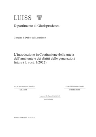Hoffmann, Ludovica (A.A. 2024/2025) L’introduzione in Costituzione della tutela dell’ambiente e dei diritti delle generazioni future (l. cost. 1/2022. Tesi di Laurea in Diritto dell'ambiente, Luiss Guido Carli, relatore Francesco Fonderico, pp. 176. [Single Cycle Master's Degree Thesis]