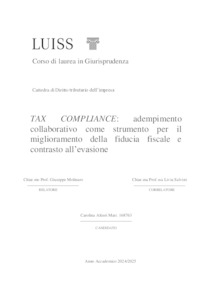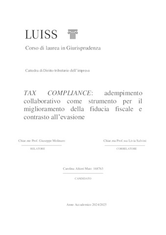 Altieri, Carolina (A.A. 2024/2025) Tax compliance: adempimento collaborativo come strumento per il miglioramento della fiducia fiscale e contrasto all’evasione. Tesi di Laurea in Diritto tributario dell'impresa, Luiss Guido Carli, relatore Giuseppe Molinaro, pp. 171. [Single Cycle Master's Degree Thesis]
