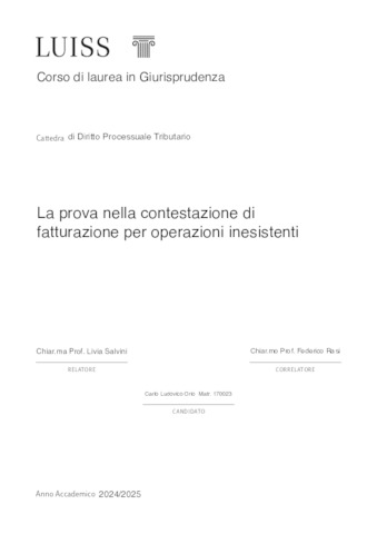 Orio, Carlo Ludovico (A.A. 2024/2025) La prova nella contestazione di fatturazione per operazioni inesistenti. Tesi di Laurea in Diritto processuale tributario, Luiss Guido Carli, relatore Livia Salvini, pp. 212. [Single Cycle Master's Degree Thesis]