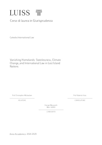Massarotti, Giorgia (A.A. 2024/2025) Vanishing homelands: statelessness, climate change and international law in lost island nations. Tesi di Laurea in Diritto internazionale, Luiss Guido Carli, relatore Christopher Michaelsen, pp. 118. [Single Cycle Master's Degree Thesis]