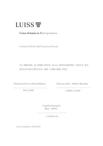 Simonelli, Camilla (A.A. 2024/2025) Le misure alternative alla detenzione: focus sui reati ostativi ex art. 4-bis ord. pen. Tesi di Laurea in Processuale penale-esecuzione penale, Luiss Guido Carli, relatore Paola Balducci, pp. 217. [Single Cycle Master's Degree Thesis]