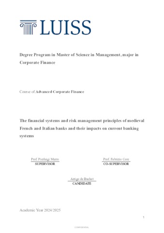 De Buchet, Arrigo (A.A. 2024/2025) The financial systems and risk management principles of medieval French and Italian banks and their impacts on current banking systems. Tesi di Laurea in Advanced corporate finance, Luiss Guido Carli, relatore Pierluigi Murro, pp. 87. [Master's Degree Thesis]