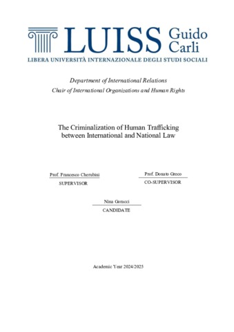 Goracci, Nina (A.A. 2024/2025) The criminalization of human trafficking between international and national law. Tesi di Laurea in International organization and human rights, Luiss Guido Carli, relatore Francesco Cherubini, pp. 145. [Master's Degree Thesis]