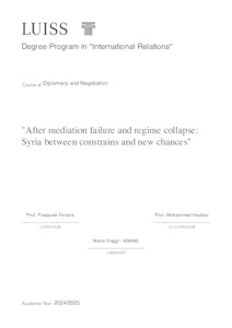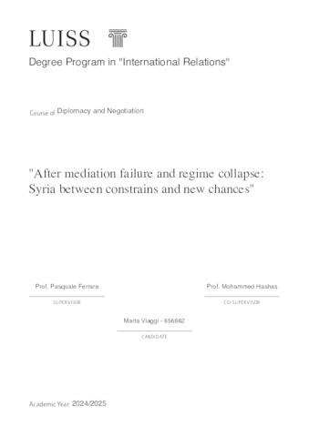 Viaggi, Marta (A.A. 2024/2025) After mediation failure and regime collapse: Syria between constrains and new chances. Tesi di Laurea in Diplomacy and negotiation, Luiss Guido Carli, relatore Pasquale Ferrara, pp. 113. [Master's Degree Thesis]