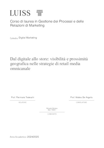Monizza, Riccardo (A.A. 2024/2025) Dal digitale allo store: visibilità e prossimità geografica nelle strategie di retail media omnicanale. Tesi di Laurea in Digital marketing, Luiss Guido Carli, relatore Piermario Tedeschi, pp. 61. [Master's Degree Thesis]