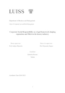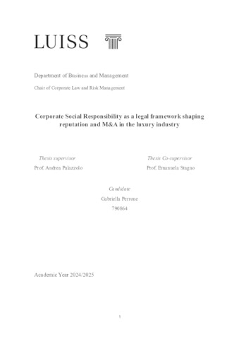 Perrone, Gabriella (A.A. 2024/2025) Corporate social responsibility as a legal framework shaping reputation and M&A in the luxury industry. Tesi di Laurea in Corporate law & risk management, Luiss Guido Carli, relatore Andrea Palazzolo, pp. 111. [Master's Degree Thesis]