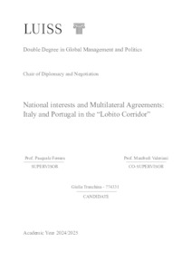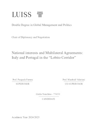 Tranchina, Giulia (A.A. 2024/2025) National interests and multilateral agreements: Italy and Portugal in the lobito corridor. Tesi di Laurea in Diplomacy and negotiation, Luiss Guido Carli, relatore Pasquale Ferrara, pp. 96. [Master's Degree Thesis]