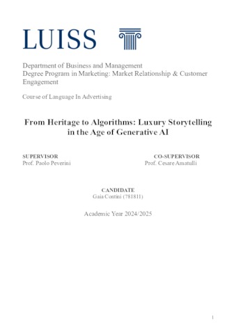 Contini, Gaia (A.A. 2024/2025) From heritage to algorithms: luxury storytelling in the age of generative AI. Tesi di Laurea in Language in advertising, Luiss Guido Carli, relatore Paolo Peverini, pp. 185. [Master's Degree Thesis]