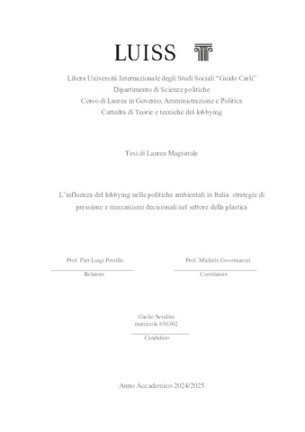 Serafini, Giulio (A.A. 2024/2025) L’influenza del lobbying nelle politiche ambientali in Italia: strategie di pressione e meccanismi decisionali nel settore della plastica. Tesi di Laurea in Teorie e tecniche del lobbying, Luiss Guido Carli, relatore Pier Luigi Petrillo, pp. 271. [Master's Degree Thesis]
