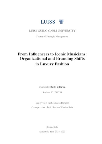 Yildiran, Beste (A.A. 2024/2025) From influencers to iconic musicians: organizational and branding shifts in luxury fashion. Tesi di Laurea in Organizational design and change, Luiss Guido Carli, relatore Daniele Mascia, pp. 94. [Master's Degree Thesis]
