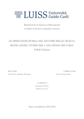 Tizzano, Alessandro (A.A. 2024/2025) Le operazioni di M&A nel settore delle telecomunicazioni: studio del caso Swisscom-Vodafone Italia. Tesi di Laurea in Finanza aziendale avanzato, Luiss Guido Carli, relatore Adalberto Pellegrino, pp. 133. [Master's Degree Thesis]