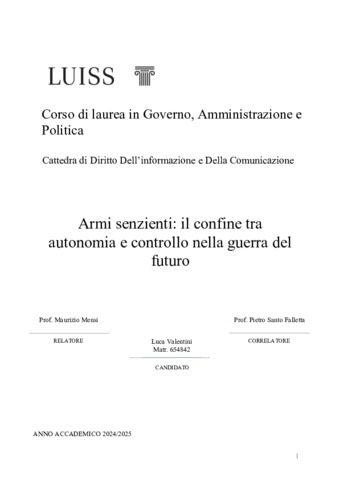 Valentini, Luca (A.A. 2024/2025) Armi senzienti: il confine tra autonomia e controllo nella guerra del futuro. Tesi di Laurea in Diritto dell'informazione e della comunicazione, Luiss Guido Carli, relatore Maurizio Mensi, pp. 85. [Master's Degree Thesis]