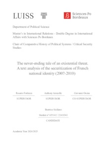 Siciliano, Beatrice (A.A. 2024/2025) The never-ending tale of an existential threat: a text analysis of the securitization of French national identity (2007-2010). Tesi di Laurea in Comparative history of political systems, Luiss Guido Carli, relatore Rosario Forlenza, pp. 140. [Master's Degree Thesis]