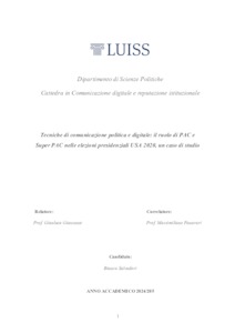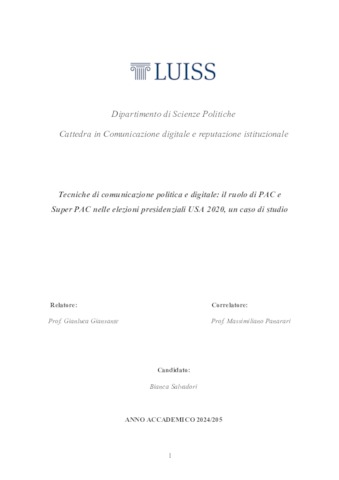 Salvadori, Bianca (A.A. 2024/2025) Tecniche di comunicazione politica e digitale: il ruolo di PAC e Super PAC nelle elezioni presidenziali USA 2020, un caso di studio. Tesi di Laurea in Comunicazione digitale e reputazione istituzionale, Luiss Guido Carli, relatore Gianluca Giansante, pp. 139. [Master's Degree Thesis]