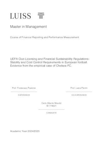 Maurizi, Carlo Alberto (A.A. 2024/2025) UEFA club licensing and financial sustainability regulations: stability and cost control requirements in European football: evidence from the empirical case of Chelsea FC. Tesi di Laurea in Financial reporting and performance measurement, Luiss Guido Carli, relatore Francesco Paolone, pp. 132. [Master's Degree Thesis]