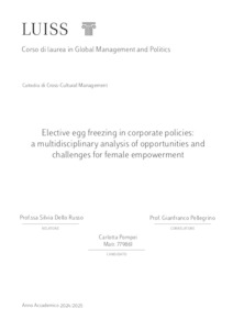Pompei, Carlotta (A.A. 2024/2025) Elective egg freezing in corporate policies: a multidisciplinary analusis of opportunities and challenges for female empowerment. Tesi di Laurea in Cross-cultural management, Luiss Guido Carli, relatore Silvia Dello Russo, pp. 71. [Master's Degree Thesis]