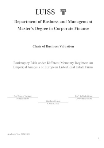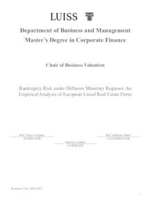Caponi, Gianluca (A.A. 2024/2025) Bankruptcy risk under different monetary regimes: an empirical analysis of European listed real estate firms. Tesi di Laurea in Business valuation, Luiss Guido Carli, relatore Marco Vulpiani, pp. 60. [Master's Degree Thesis]