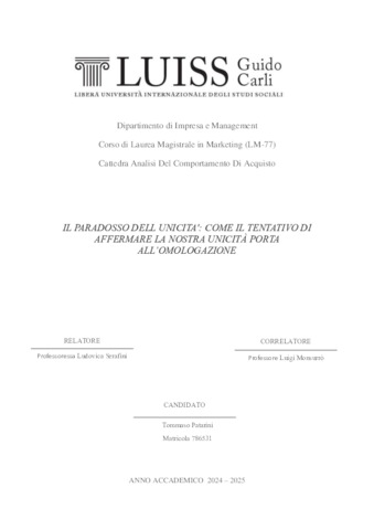 Patarini, Tommaso (A.A. 2024/2025) Il paradosso dell’unicità: come il tentativo di affermare la nostra unicità porta all’omologazione. Tesi di Laurea in Analisi del comportamento di acquisto, Luiss Guido Carli, relatore Ludovica Serafini, pp. 90. [Master's Degree Thesis]