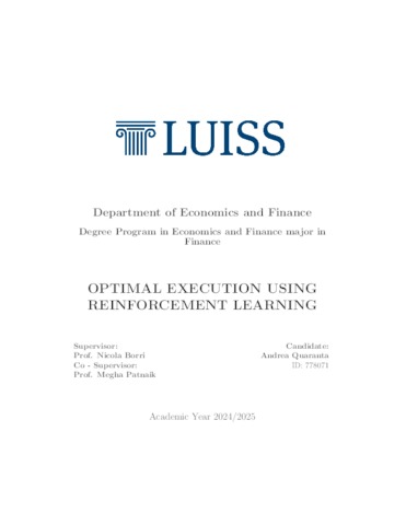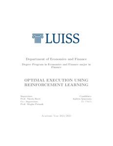 Quaranta, Andrea (A.A. 2024/2025) Optimal execution using reinforcement learning. Tesi di Laurea in Financial economics, Luiss Guido Carli, relatore Nicola Borri, pp. 57. [Master's Degree Thesis]