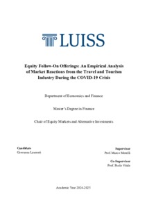 Laurenti, Giovanna (A.A. 2024/2025) Equity follow-on offerings: an empirical analysis of market reactions from the travel and tourism industry during the Covid-19 crisis. Tesi di Laurea in Equity markets and alternative investments, Luiss Guido Carli, relatore Marco Morelli, pp. 82. [Master's Degree Thesis]